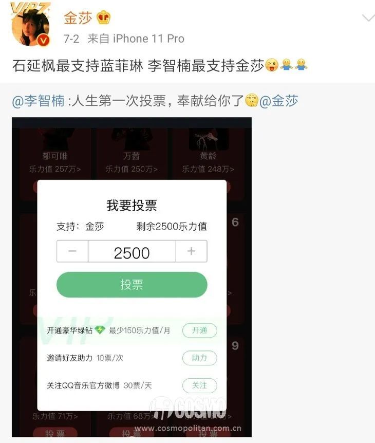 姐姐打投时,李智楠还尝试了人生第一次投票,打投2500票。(谁说直男追星不氪金的?)金莎转发配文,“石延枫最支持蓝菲琳,李智楠最支持金莎。”