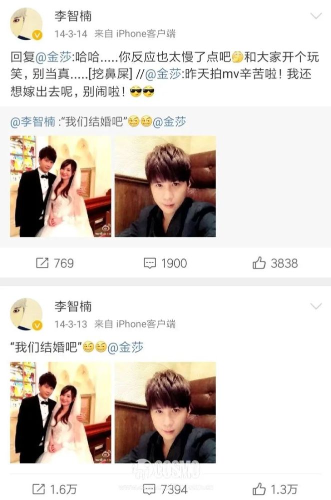14年李智楠在个人微博上发布了一张他们的“结婚照”,配文“我们结婚吧”。这一次,差点让全世界以为他们要在一起了,结果却是“乌龙”。