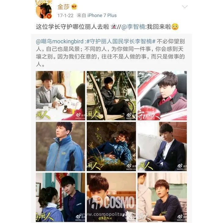 17年李智楠新戏《守护丽人》开播,金莎转发并配文“这位学长守护哪位丽人去啦?”也不失为一种给力的宣传。