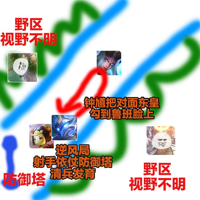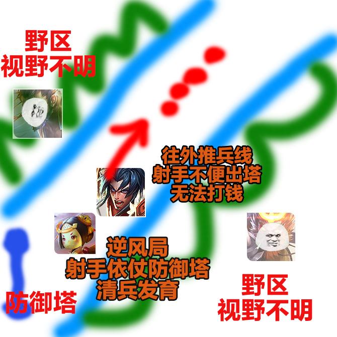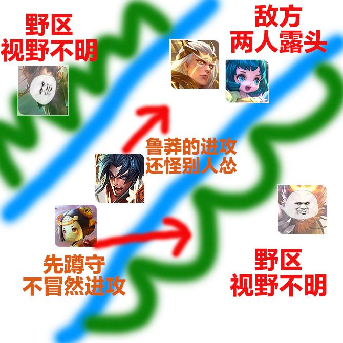 (1)比如我方:刘备老虎要频繁进入野区反野的前期节奏英雄,这时己方辅助拿个孙膑直接炸一半,孙膑前期没用,很难打出前期优势。