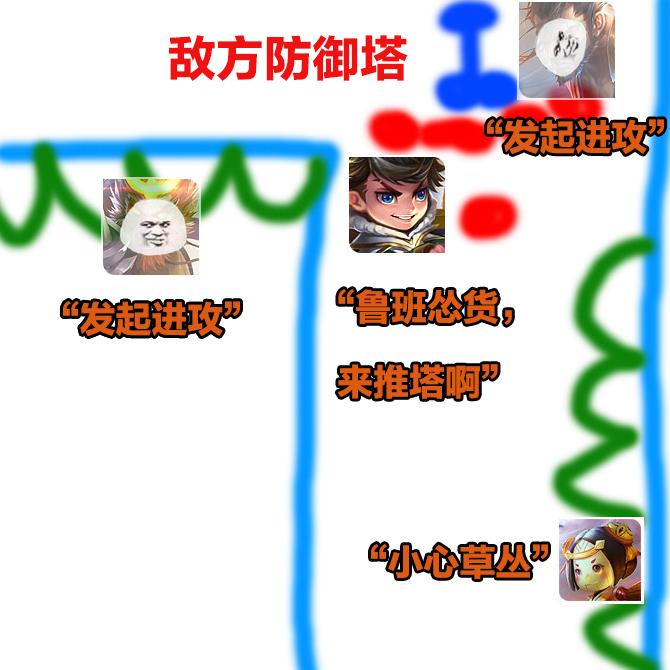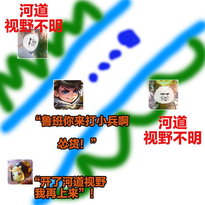 第二个案例,逆风局,野区沦陷,鲁班退守防御塔前清兵,两侧草丛和野区视野不明,项羽果断把兵线往外推,鲁班放弃清兵打钱,依然固守塔前。项羽怒喷鲁班不发育。