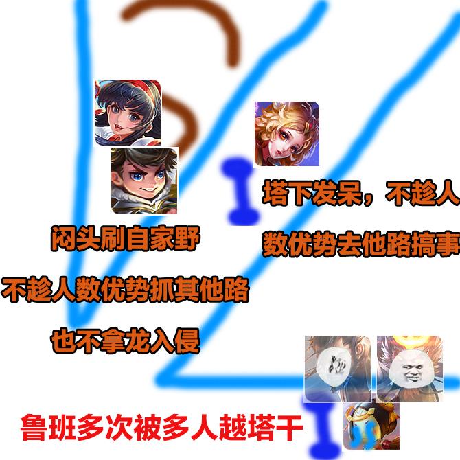 敌方3人抓下,中路、上路仅剩2人,己方剩余4人为何不趁势推中,推上,或者入侵对手红区?不懂得利用人数优势联动,又不注重开红区视野保护鲁班,又怎么能怪鲁班呢?鲁班若是放掉下塔,不论是蹲守下路二塔,还是去其他路蹭线,都会严重影响发育,人家也没得选择。