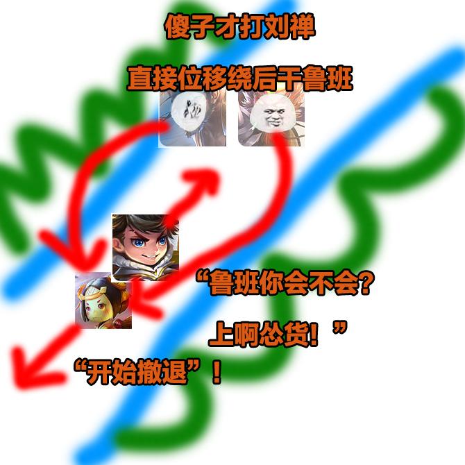 原因:如图所示,敌方猴子已经到四蹲守。鲁班若贸然上前,塔未必能推掉,自己的命倒是要交代。此时刘禅的正确做法示范如下: