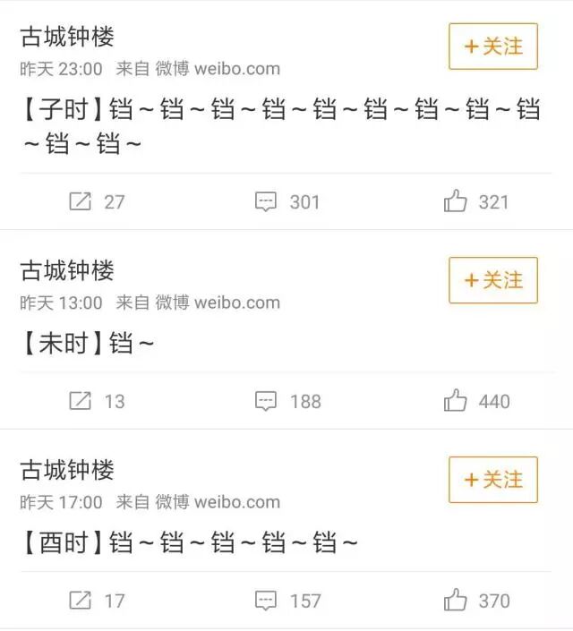 哎,就是它啦。它是一座西安的钟楼,是一处历史遗迹哦。但是它与上面二位相比就专业多了,每天都会准时敲钟,而且它的粉丝数更是达到了101万。