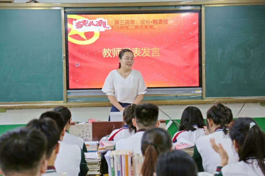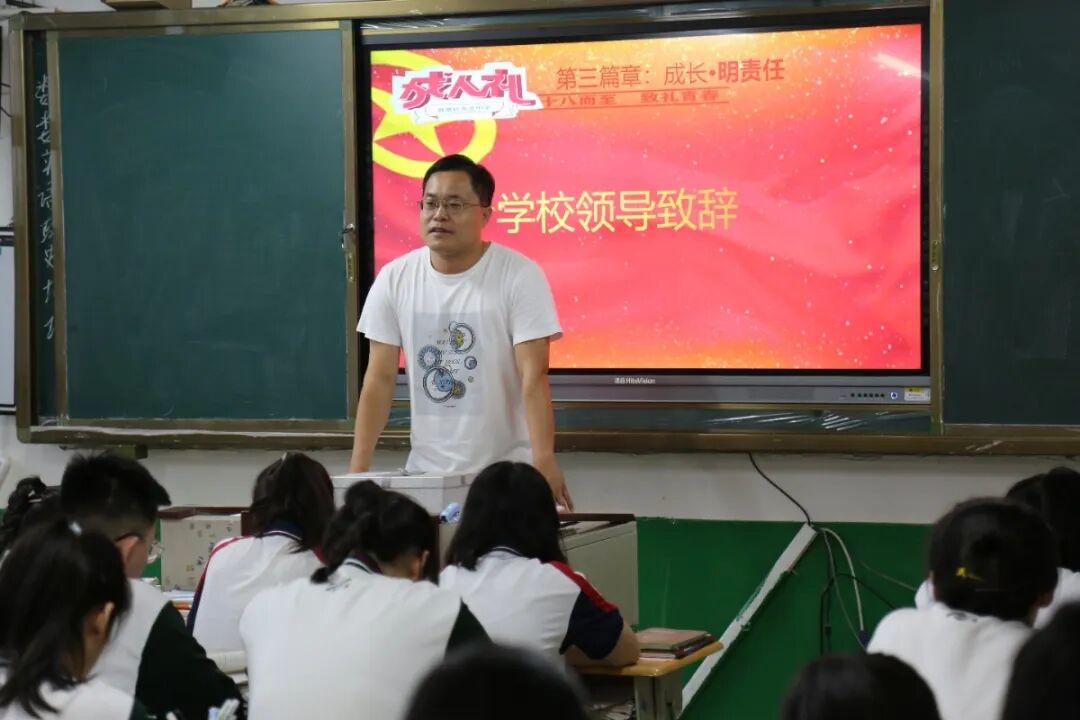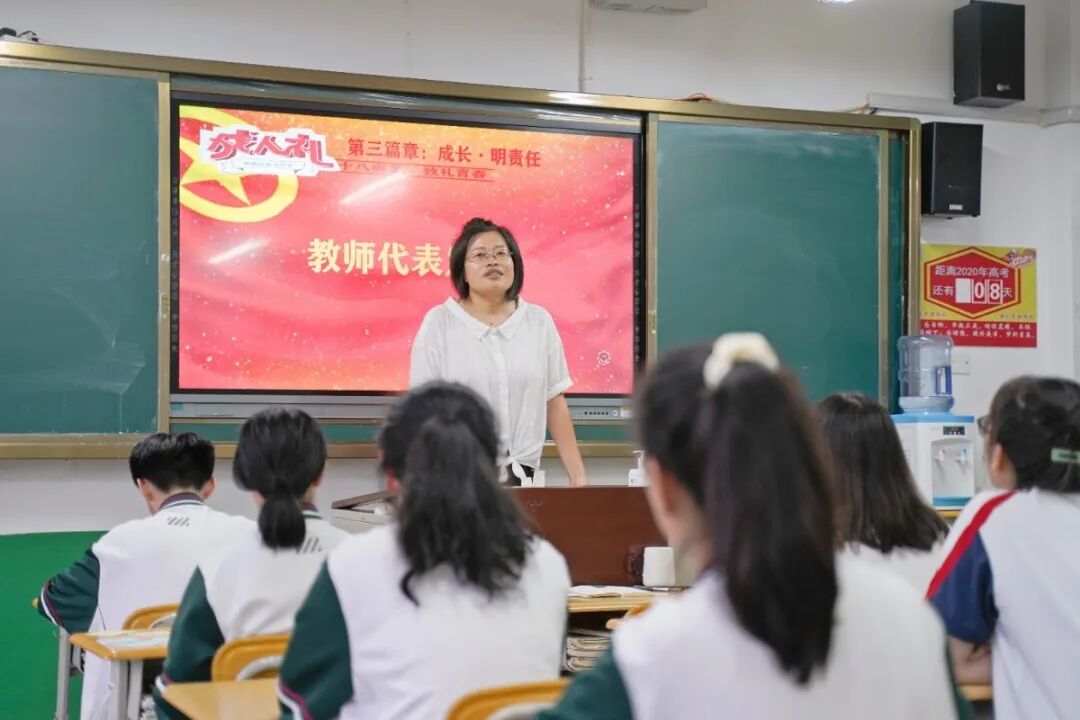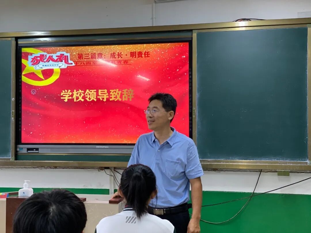 由于疫情防控的要求,今年的成人仪式与往年有所不同,没有父母的现场陪伴和见证,没有盛大热烈的场景。但我相信,此时此刻,你们一如历届优秀学子,心中有火,眼里有光!也有人说,2020届学生生于非典时期、考于新冠战疫,是疾风劲草,是烈火真金!你们更加懂得家国情怀,你们更加理解‘殷忧启圣,多难兴邦’。你们也必将是传奇的一代,思想上、精神里镌刻着这个时代的烙印。“天戴其苍,地履其黄,前途似海,来日方长”,你们一定注意到了今天仪式的主题:十八而志,不负韶华。