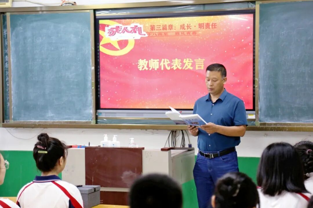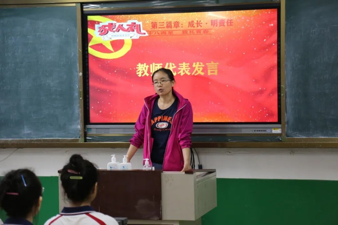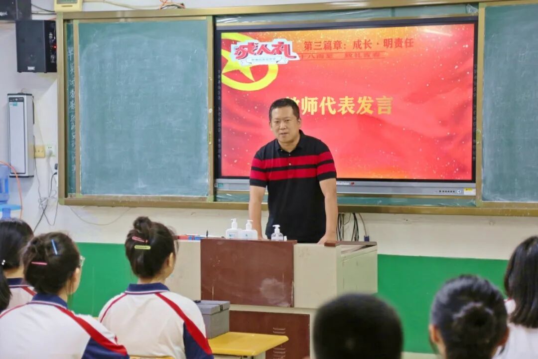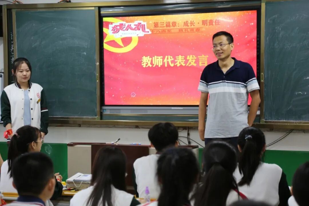 由于疫情防控的要求,今年的成人仪式与往年有所不同,没有父母的现场陪伴和见证,没有盛大热烈的场景。但我相信,此时此刻,你们一如历届优秀学子,心中有火,眼里有光!也有人说,2020届学生生于非典时期、考于新冠战疫,是疾风劲草,是烈火真金!你们更加懂得家国情怀,你们更加理解‘殷忧启圣,多难兴邦’。你们也必将是传奇的一代,思想上、精神里镌刻着这个时代的烙印。“天戴其苍,地履其黄,前途似海,来日方长”,你们一定注意到了今天仪式的主题:十八而志,不负韶华。