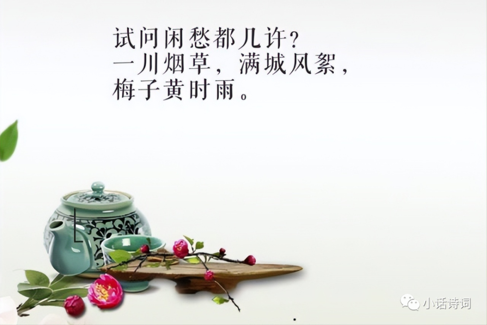 碧云冉冉蘅皋暮,彩笔新题断肠句。试问闲愁都几许?一川烟草,满城风絮,梅子黄时雨。
