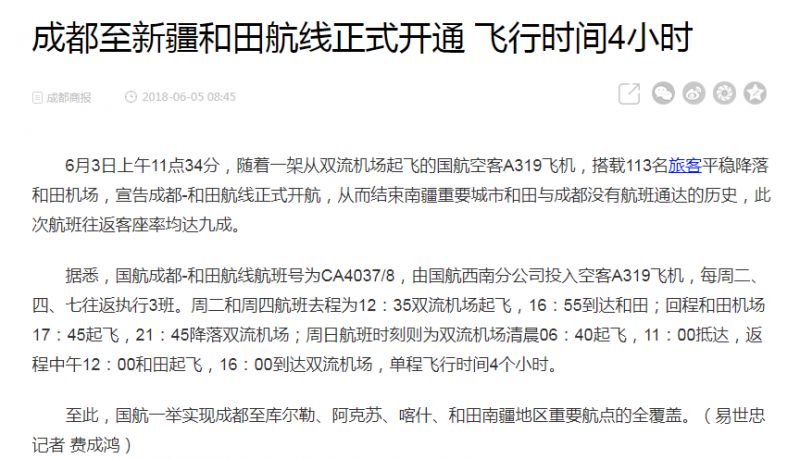 成都至新疆和田航线6月4日开通,飞行4小时看!