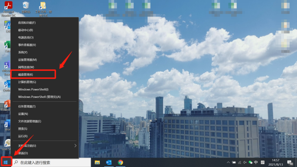 首先,找到桌面左下角的Windows图标(窗口形状),鼠标选中并右击,在弹出框中选中“磁盘管理”并点击进入。