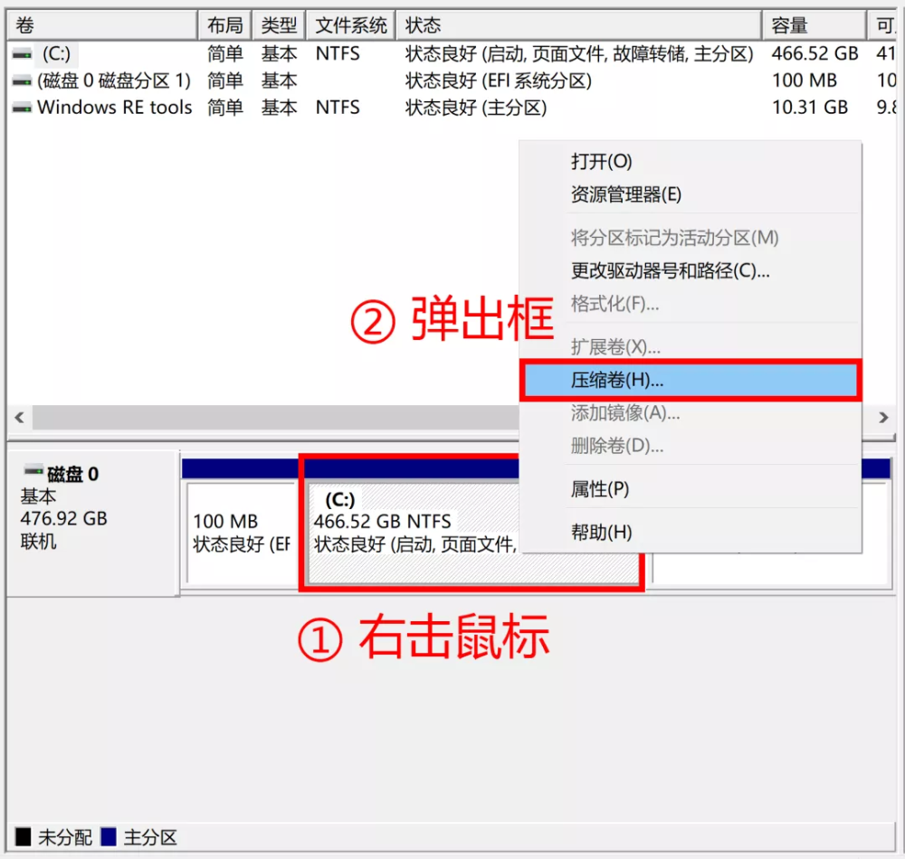 在分区列表中,右键点击希望重新分区的部分(以C盘为例),选择“压缩卷”,系统经过分析后会给出可用压缩容量。