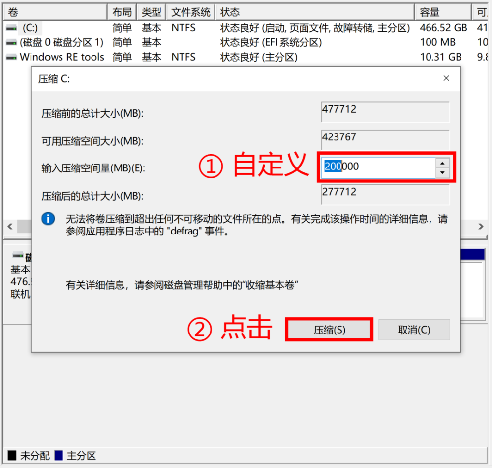 接着输入需要的新分区容量大小,然后点击“压缩”。