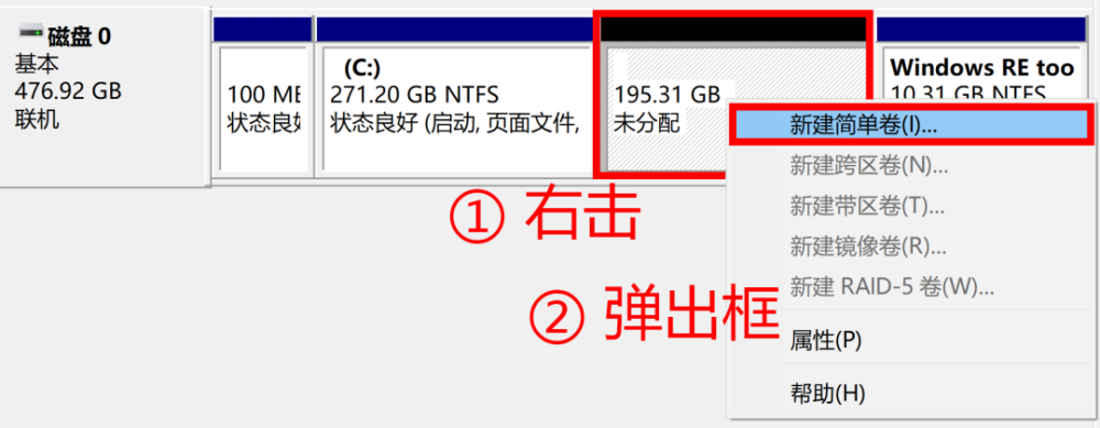 压缩完成之后,会出现一个新的“未分配”磁盘,选中之后鼠标右击,在新弹出的窗口中点击“新建简单卷”。
