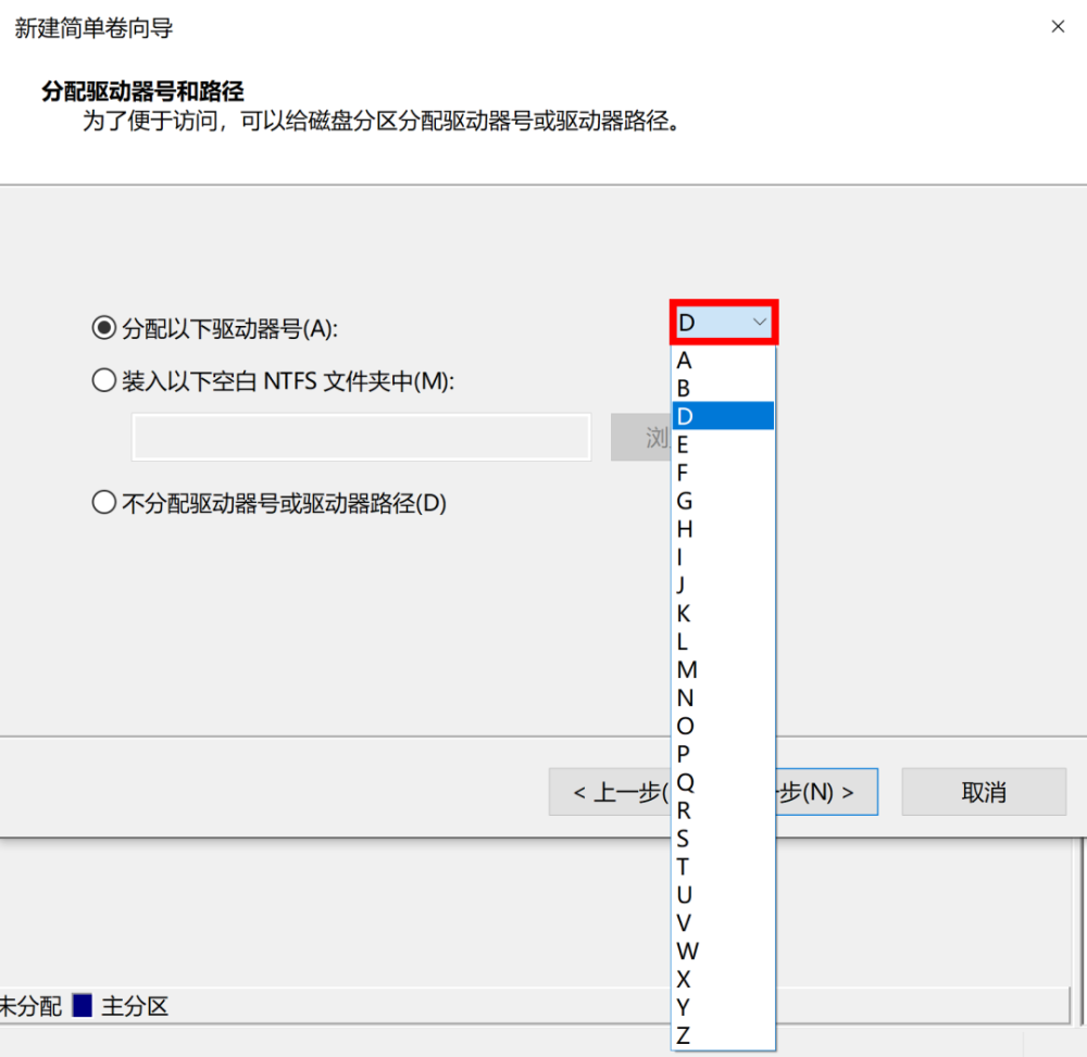 这里的驱动器号可以自主选择,除了C以外,有ABDE...一直到字母Z供选择,选好继续“下一步”。