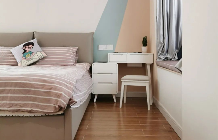 正常卧室大的话,床都是两侧都是要留过道的,但如果卧室面积真是小得可怜的话,那么不妨试试把床的侧边也靠墙布置,这样起码能保障睡觉空间宽敞。