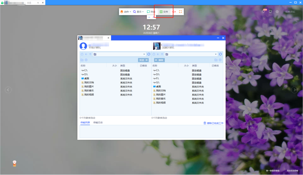 点击控制页面顶部菜单文件按钮即可开启文件传输功能,或者直接点击拖拽需要传输的文件也可实现文件传输。