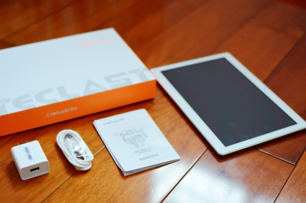 开箱之后,配件也是必要而且常规的几样:平板电脑、充电器、数据线、说明书。这些配件简单齐全。