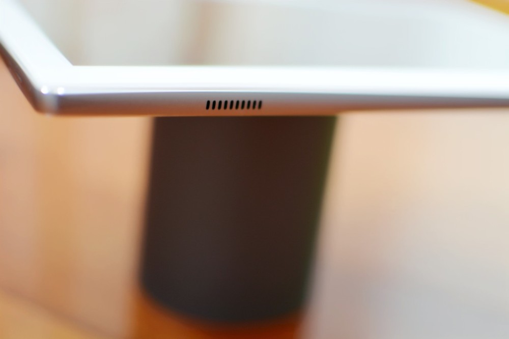 平板两侧还各有一个扬声器栅栏组成立体声扬声器,由于有两个扬声器,所以平板出来的声音较大。