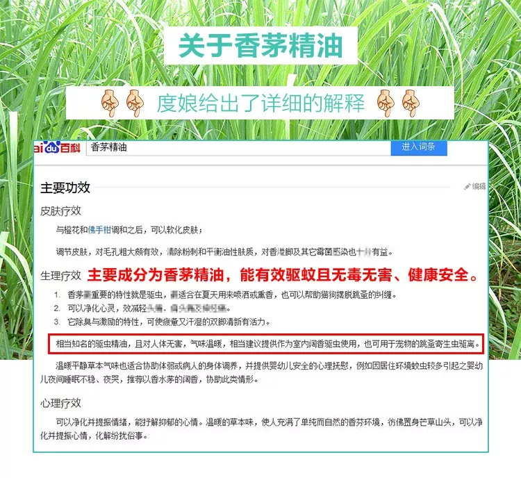 虽然有非常强大的驱蚊效果,但是它对人体是无毒无害的,不少国家会拿香茅草入药或做调味品,或者做成肥皂,它还是薄荷脑的原料之一。