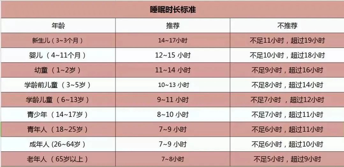 当然,这个表只是参考,具体要以自己的实际情况为准。通常来说,好的睡眠有两个要求:有规律+睡得够。举个例子,假如你的每天推荐睡眠时长是8小时,而你习惯每天凌晨1点睡,早上9点起,起来感觉一点也不困,这也算合格的睡眠。但也有研究表明,晚睡也会伤身,所以建议大家还是尽量早睡早起。