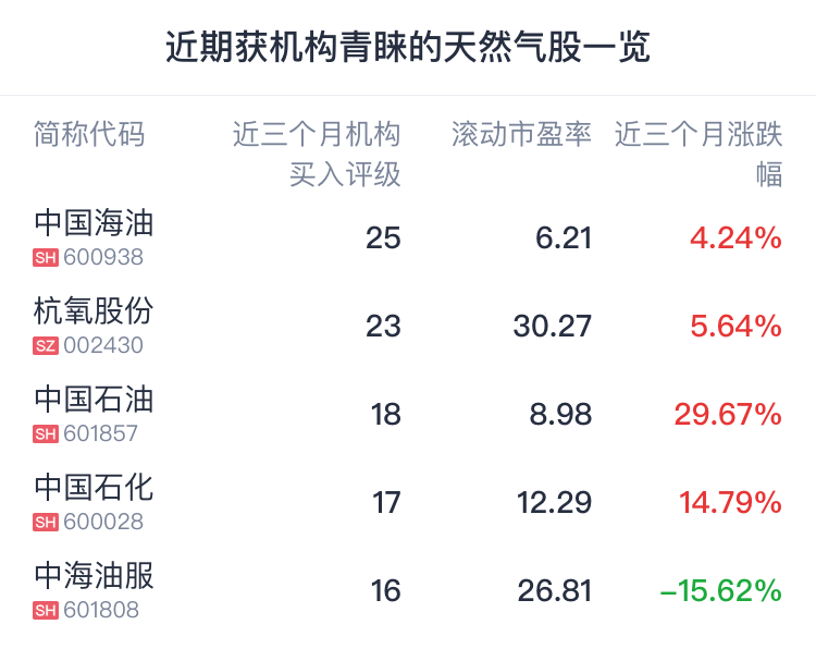 腾讯自选股统计了近三个月获机构青睐的天然气股名单,仅供读者参考。数据显示,近三个月中国海油获25家机构买入评级居首,其次的杭氧股份、中国石油、中国石化、中海油服等均获机构买入评级超10家。