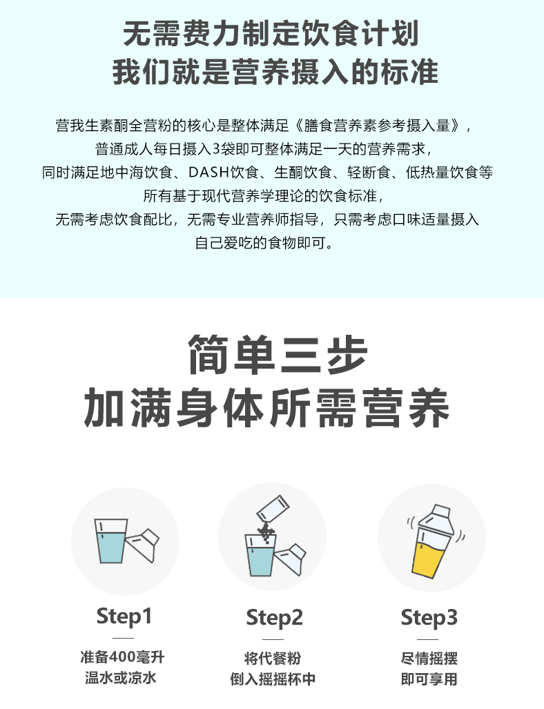 1。适用于4岁及以上人群,成人每日摄入2-3袋即可整体满足膳食营养素参考摄入量。
