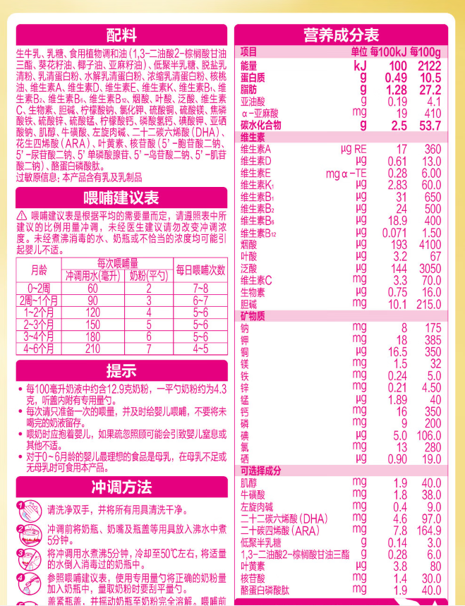 1。首先膳食营养素参考摄入量中规定了30余种必需营养素,你得按照标准把所有营养元素都合理摄入才行,但是你看上面的营养成分表,是不是只有10来种营养元素,剩下那些必需营养元素不是说没有,而是说量太少了,无法对人体产生实质性的影响。我们再来看看针对婴幼儿的配方奶粉: