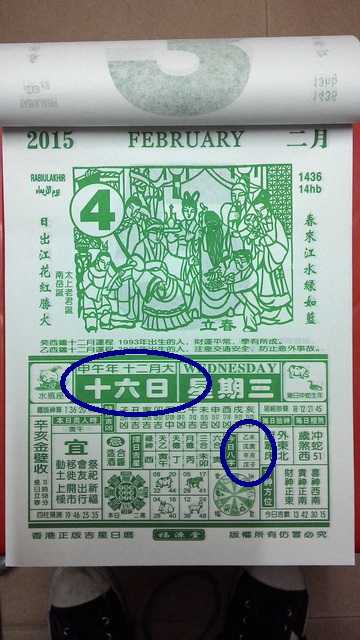 再看2015年的老黄历,立春当天,是农历十二月十六,所以干支纪年的记载仍是“甲午年”,而只有在“今日八字”一栏,年柱才变更为乙未。