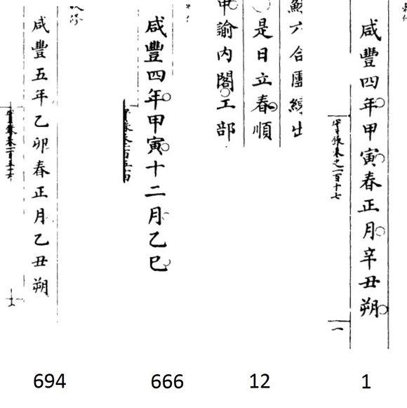 因此,当遇到立春出现在正月初一之后,《清实录》只会标记为”是日立春“。按照立春派的观点,如果标记“癸未年立春”即意味着干支纪年的更变,为何并非每年的立春都这样标记,难道只需要一部分年份才变更干支吗?这根本就无法自圆其说。最为决定性的是立春在十二月十五的情形。1871年2月4日(同治九年十二月十五),里边有写“辛未年立春”,如果这是干支转换的证据。为何在第二天,清实录上仍记载“同治九年十二月庚午”,难道不是过了立春就是换了干支吗?事实上只有到了1871年2月19日,清实录的抬头才转换为“同治十年辛未春正月朔”。