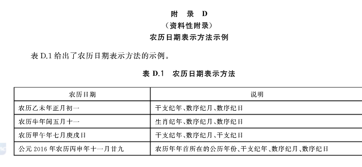 农历的表示方法指农历年、农历月、农历日的命名方式,以及农历日期的标识方式。本标准规定的农历表示方法遵循中国传统历法的表示方法:农历年按照干支纪法和生肖纪法命名,农历月按照数序纪法命名,农历日按照数序纪法和干支纪法命名。农历日期的标识则按照“农历”以及农历年、农历月、农历日名称顺序组合而成。