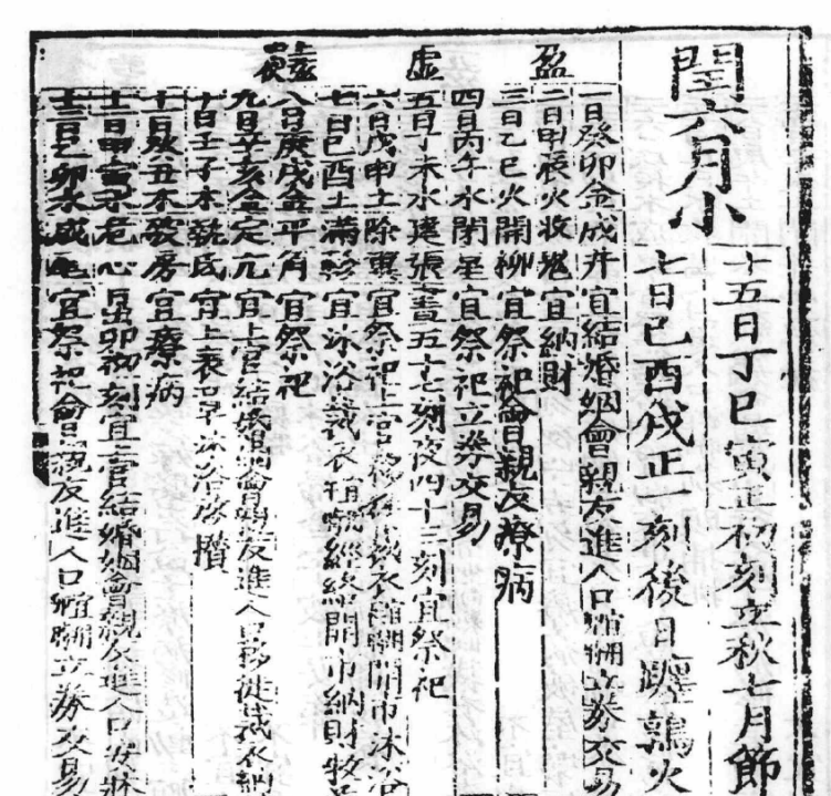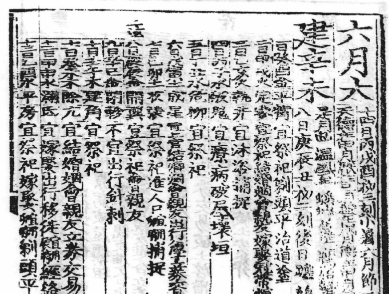 明清两代的黄历,会逐月记载日期,在每个月的抬头,已经记载当月的干支纪月,上图中的六月,建乙未,从初一开始逐日列举。另外该年的六月初一晚于小暑,所以在最右边特意使用“前月”来记载小暑的时刻,明确小暑不属于“建乙未”的六月,从而彻底驳斥干支纪月以节气为分界的错误观点。