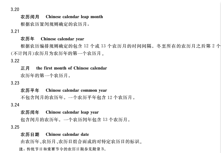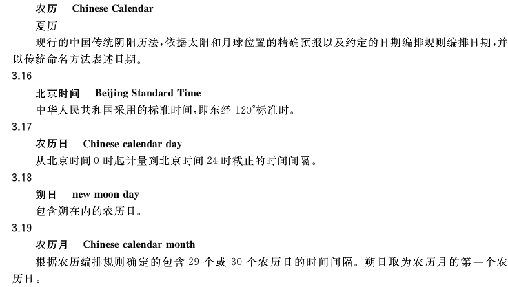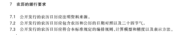 6。标准制定的背景、说明。现摘录一下,大意是:长期以来,农历标准存在混乱,农历发布和发行管理规定的缺失,又会进一步导致因为自行编算或辗转复制而内容错误的农历日历公开发行给社会带来的混乱。因此为了保证农历编算的准确性和权威性,并有效维护农历作为国家历法的统一性和严肃性,有必要规范农历的编算和颁行工作,制定国家标准。