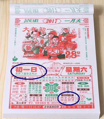 再看看当前以老黄历形式印制的纸质版日历,以2017年丁酉年正月初一为例,春节在2017年1月28日,在立春之前,但干支纪年已经标记为丁酉年,而右下方的“今日八字”一栏,记载的当天出生的人的八字,最左边一列为年柱,仍处于丙申的状态。换句话,老黄历中的干支纪年和八字的是分开来记载,干支纪年是属于农历的,遵循正月初一开始,实在不知道哪位命理学大师和学者,居然能够得出老黄历支持从立春开始的证据?!