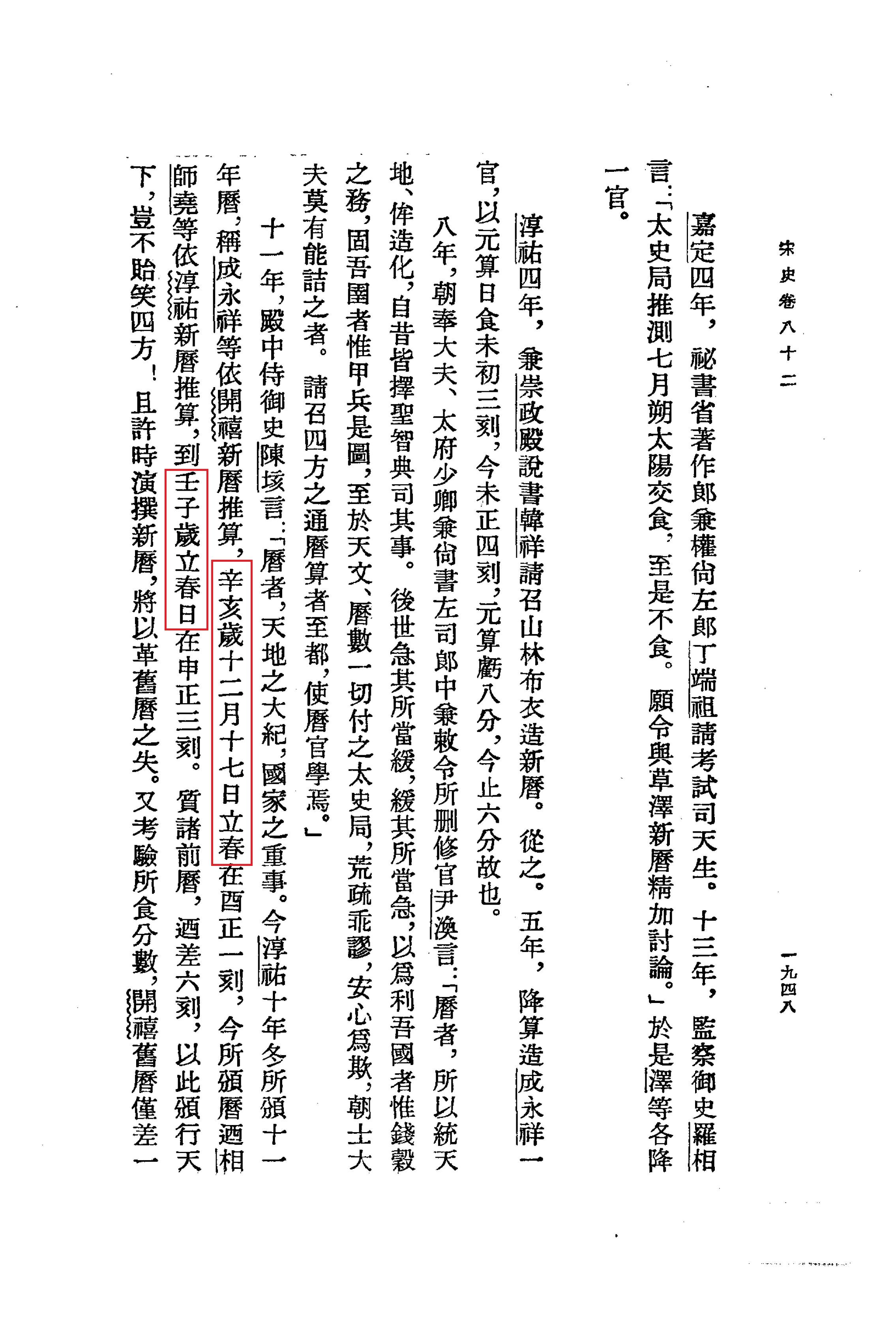 《宋史·律历十五》记有:“今淳祐十年冬所颁十一年历,称成永祥等依《开禧》新历推算,辛亥岁十二月十七日立春在酉正一刻,今所颁历乃相师尧等依《淳祐》新历推算,到壬子岁立春日在申正三刻。”“辛亥岁十二月十七日”与“壬子岁立春日”对举,明矣。这个也和《清实录》相呼应,证明标记“XX年立春”,仅仅说明这个立春是下一年的立春,但纪年仍视为年末。