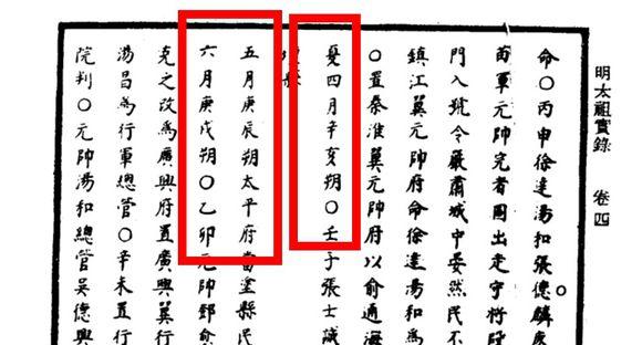 但是若非正月,则只会显示农历的月序和朔日(初一日)的干支,丙申年(1356年),“夏四月辛亥朔”,“五月庚辰朔”,“六月庚戌朔”