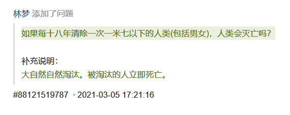 医学杂志《柳叶刀》的数据显示,2020年,世界上男性、女性平均身高最高的国家均为尼德兰,其成年男性平均身高为183.8厘米,成年女性平均身高为170.4厘米。如果有谁提前告知人们这件事,并展示了相应的证据让人们相信而不是将此人送进精神病院, 那么人们会直接将身体加长来躲过清除: