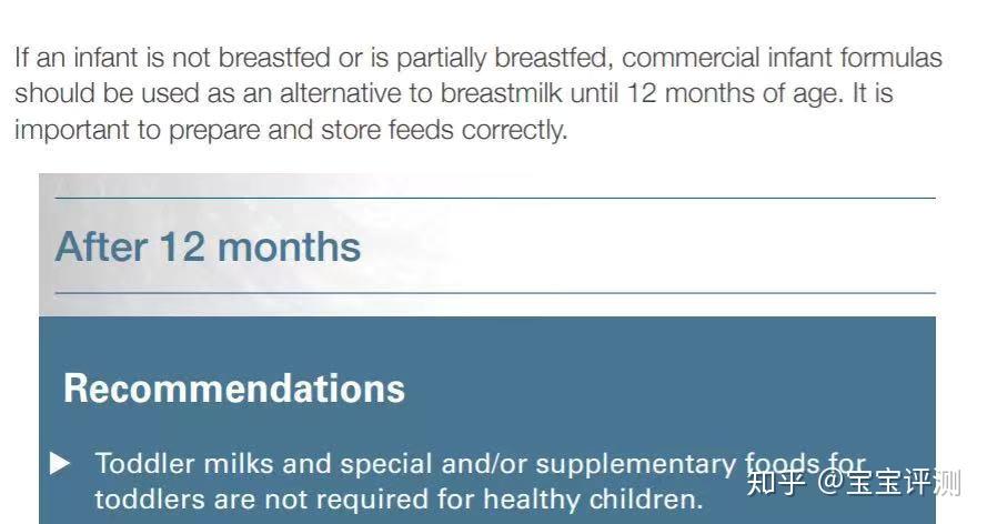 在澳大利亚卫生部发布的《澳大利亚膳食指南》中也提到,配方奶粉可以作为母乳的替代品喂养至12个月。12个月以后,健康的宝宝已不再需要特殊的幼儿奶和补充食品了。
