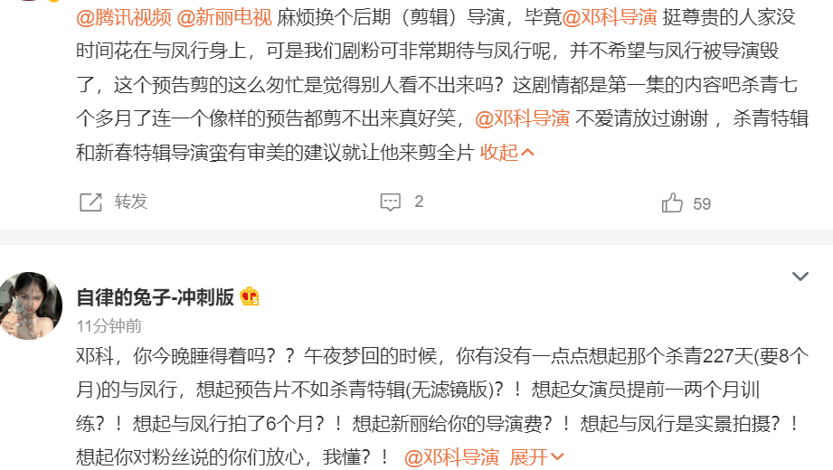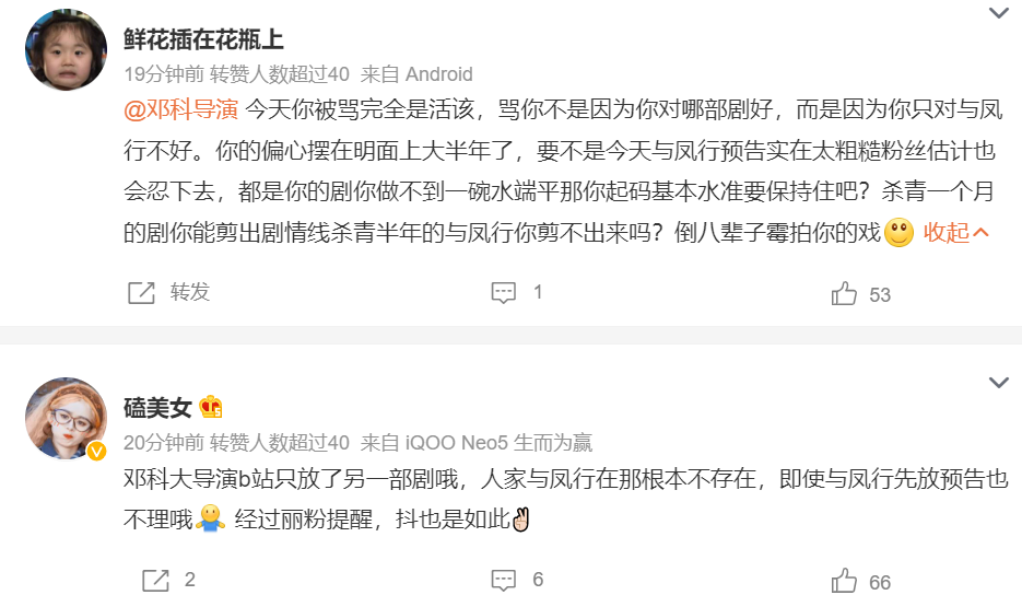 作为导演做不到一碗水端平,怪不得粉丝纷纷谴责。b站与凤行只有一个调色视频,剩下的全部都是折腰相关。折腰在搞精剪,与凤行粗剪,拉垮敷衍了事的心溢出屏幕了。
