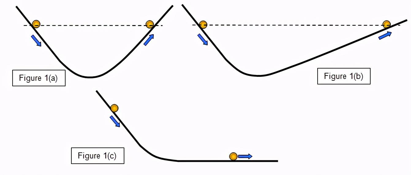 最后,我把右边的斜坡完全放平,那右边就变成了一个平面,高度永远不变了。这样,无论小球运动多久,运动多远,都不可能再回到左边的高度。