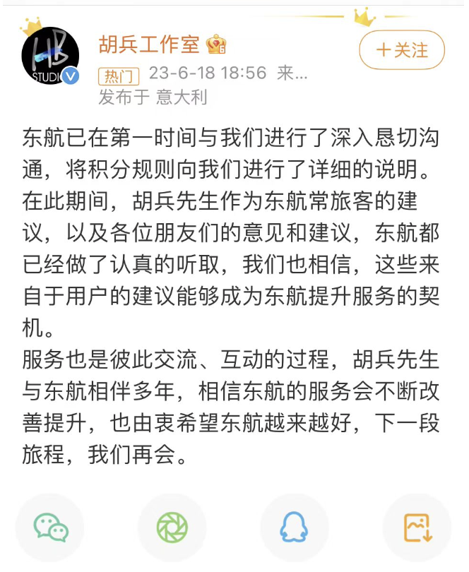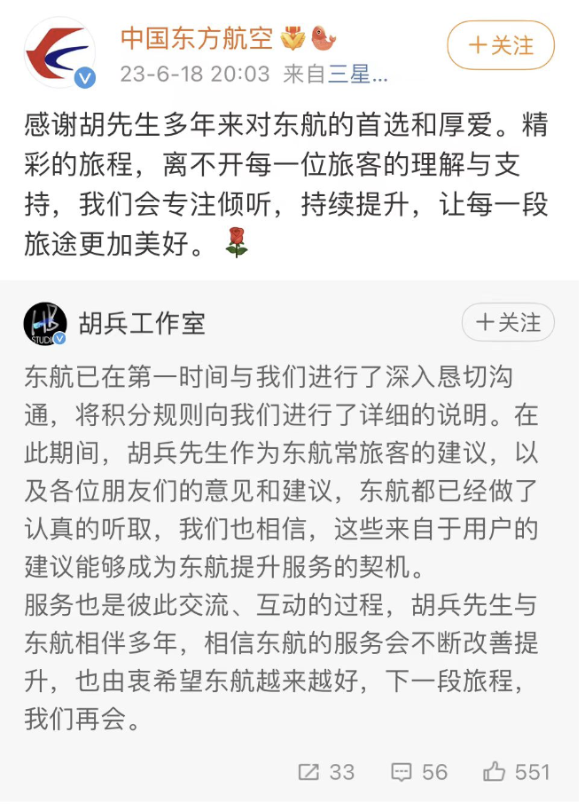 东航已在第一时间与我们进行了深入恳切沟通,将积分规则向我们进行了详细的说明。在此期间,胡兵先生作为东航常旅客的建议,以及各位朋友们的意见和建议,东航都已经做了认真的听取,我们也相信,这些来自于用户的建议能够成为东航提升服务的契机。