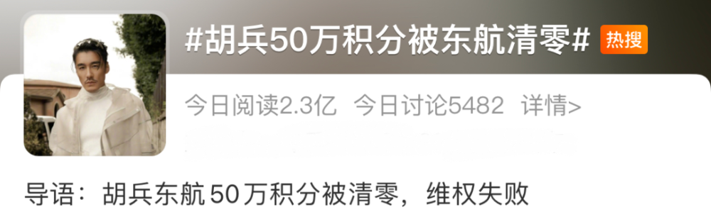 “胡兵50万积分被东航清零”