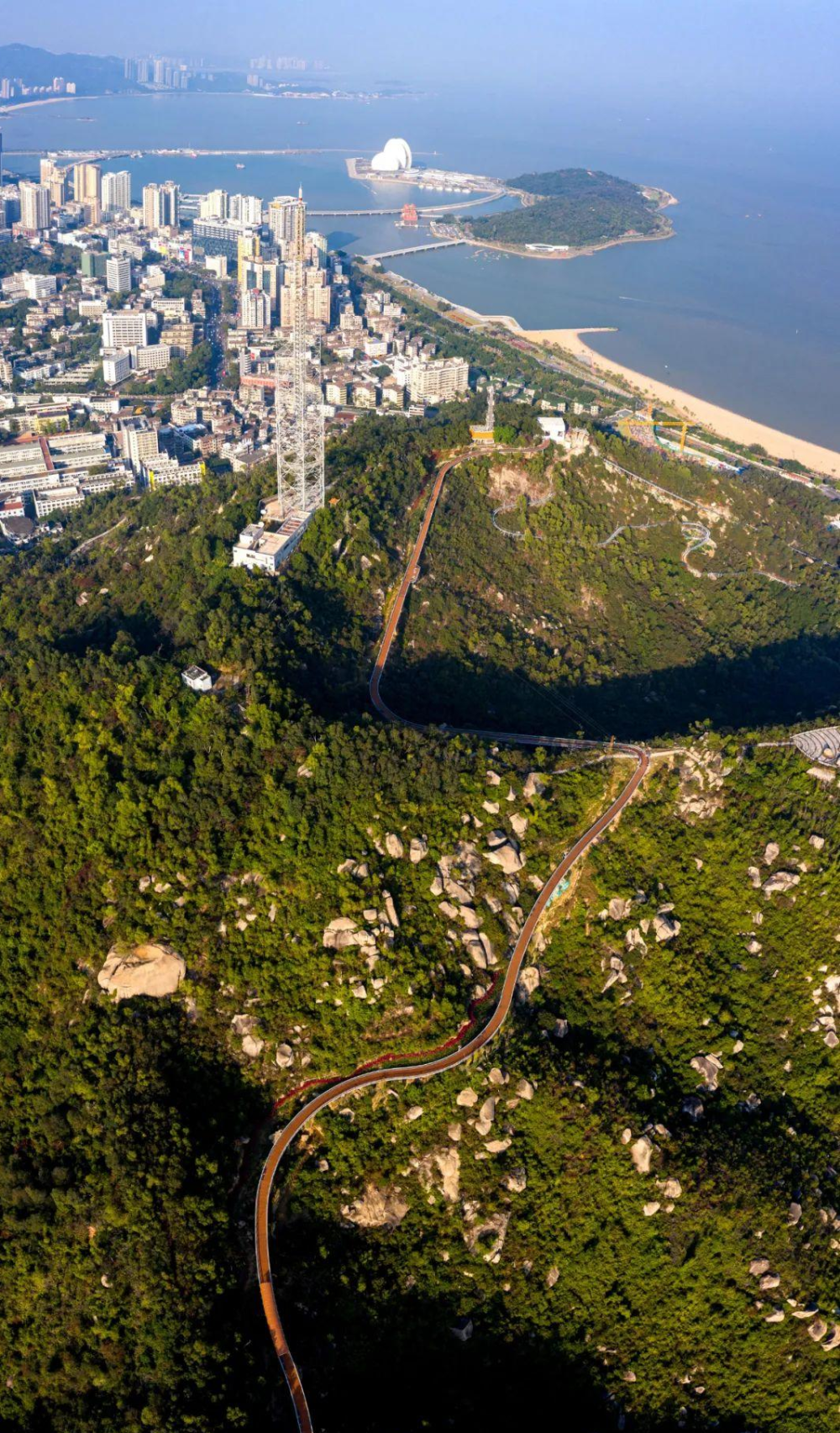 整个步道本着“低干扰,轻介入”的理念,顺势而为,依山而建。云道一共分成揽湖、观水、阅城、瞰海四个主题,将多个景点无缝连接,漫步其中,人与自然和谐共融,感受城市的脉动与浪漫。