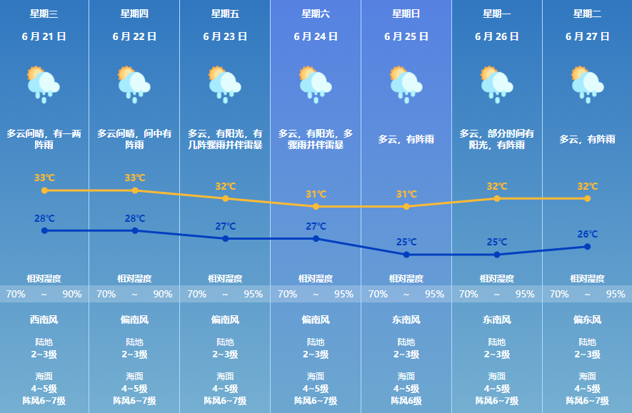 据预报,端午假期(6 月 22-24 日)珠海市以多云天气为主,多骤雨,并伴有雷暴。