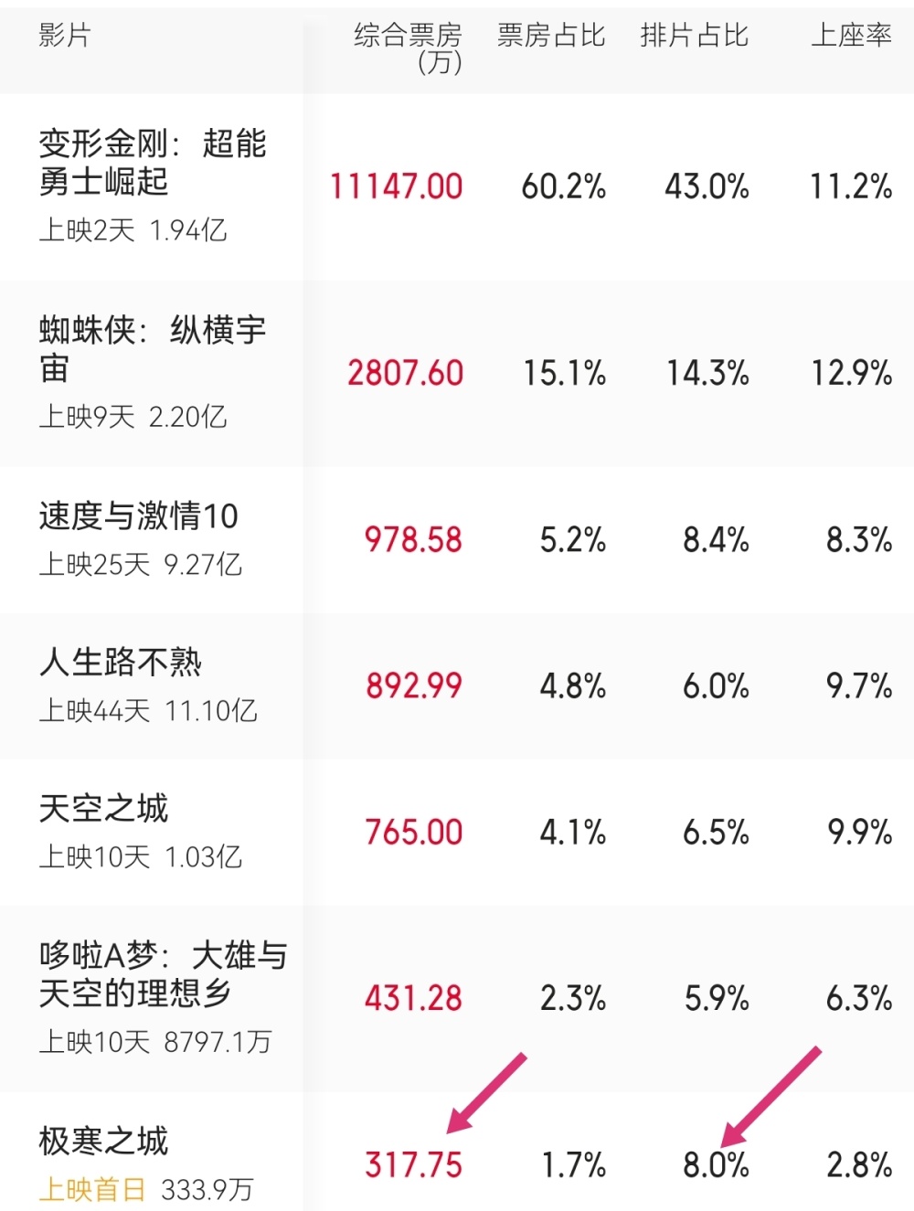 首映当日,因为有《变形金刚》和《蜘蛛侠》等大咖,所以资源紧缺,但院线还是给予了8%的排片,可《极寒之城》却只拿下了317万票房。