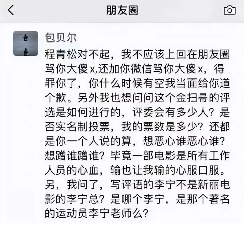 去年,包贝尔就因为翻拍韩版的《阳光姐妹淘》获得“最令人失望导演奖”,在朋友圈“炮轰”主办人程青松。