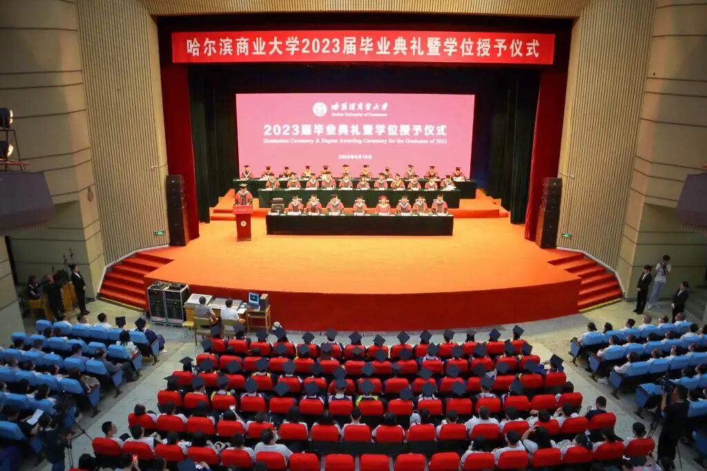 校学位评定委员会副主席、副校长赵大伟宣读博士、硕士、学士学位授予文件;校党委副书记田成义宣读优秀毕业生表彰文件;校学位评定委员会主席、校长郑秋鹛分别为博士、硕士和学士毕业生拨流苏、颁发学位证书;全体校领导为优秀毕业生代表颁发荣誉证书。财政与公共管理学院2020级行政管理专业硕士研究生孙靖然,国际教育学院2020级旅游与酒店管理专业硕士研究生萨米尔,法学院2020级法学专业学生郭童、金融学院院长姚凤阁教授,全国政协委员、哈尔滨东盛金材科技(集团)股份有限公司董事长张忠凯分别代表2023届全体毕业生、毕业留学生、在校生、教师和校友发言。