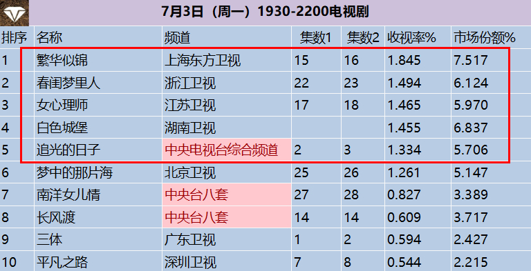 手机访问:wap.265xx.com电视剧收视率排行榜,《追光的日子》排第五,第一收视高达1.845%