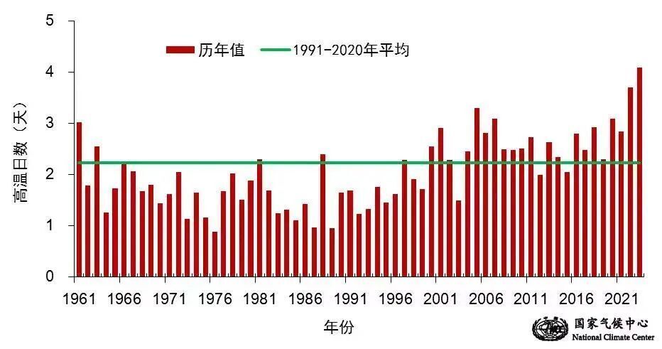 1月1日至6月30日全国平均高温日数历年变化(1961-2023年)