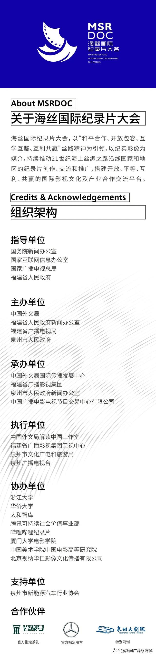 李冀平 | 泉州市政协原副主席,副研究员,福建省海洋文化研究中心特约研究员王雁 | 国家地理品牌内容及频道总监张艾弓 | 电影暨视听艺术博士,厦门大学电影学院副教授、博士生导师,厦门大学音像文献中心主任暨电影博物馆馆长,欧盟伊拉斯谟+(Erasmus +)计划高级访问学者杨旭东 | 中共泉州市委宣传部副部长,泉州广播电视台党委书记,台长徐红蔚 | 制片人,福建省广播影视集团卫视中心副主任林芊语 | 中国人民大学新闻学院博士生