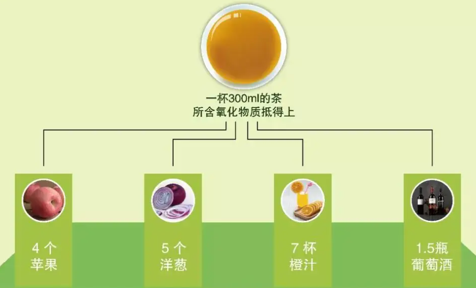有一个著名的抗氧化能力比较实验,得出这样一个有趣的公式:2杯绿茶=4个苹果=5个洋葱=7杯橙汁。