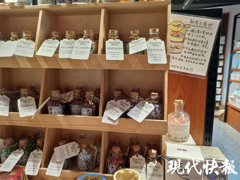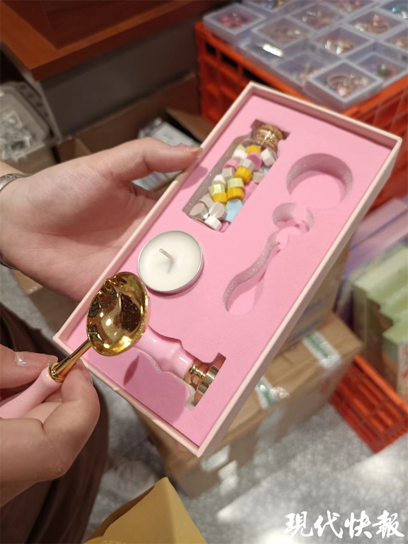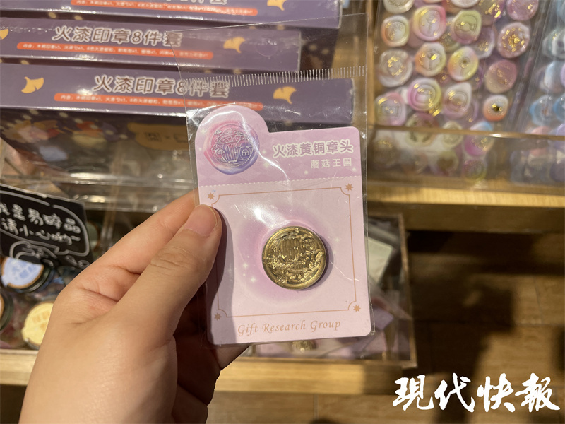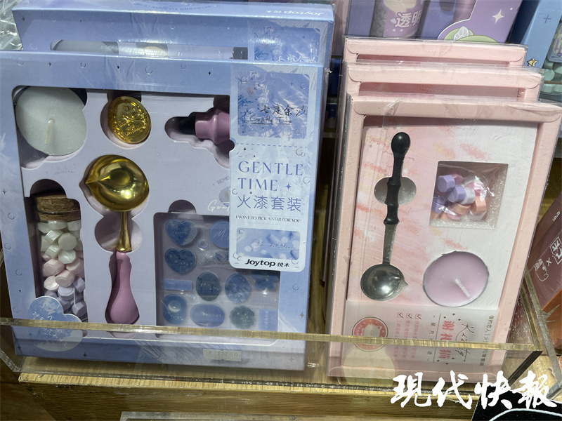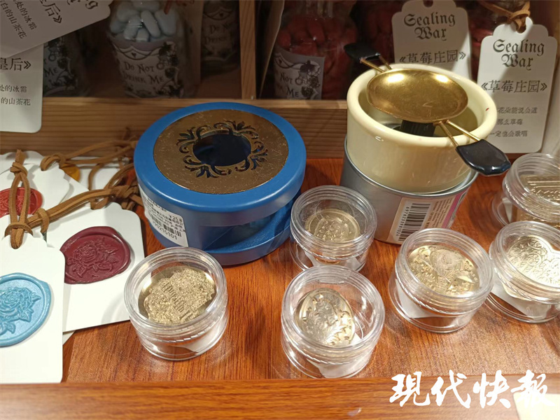 7月4日,记者走访了一些文具店和潮玩专卖店,发现很多店铺都在销售火漆印章。火漆印章虽然看似平价,但如果想要做出精美的印章,仅仅是基本款,是不够的。在雨花台区某大型商场里的一家潮玩店中,就有许多火漆印章及其周边产品在售卖。一整套火漆印章产品,按照豪华程度的不同,售价从39.9元-99.9元不等。不过,一整套火漆印章产品中,通常只包含一枚火漆黄铜章头。若是想玩出花样,玩出新意,那么更换火漆黄铜章头就成了最直接的方法。在该潮玩店内,也有火漆黄铜章头单独售卖,一枚火漆黄铜章头的售价就要29元。不仅如此,蜡块也可以单独售卖,有颜色不一的蜡块可供选择,统一售价19元一瓶。